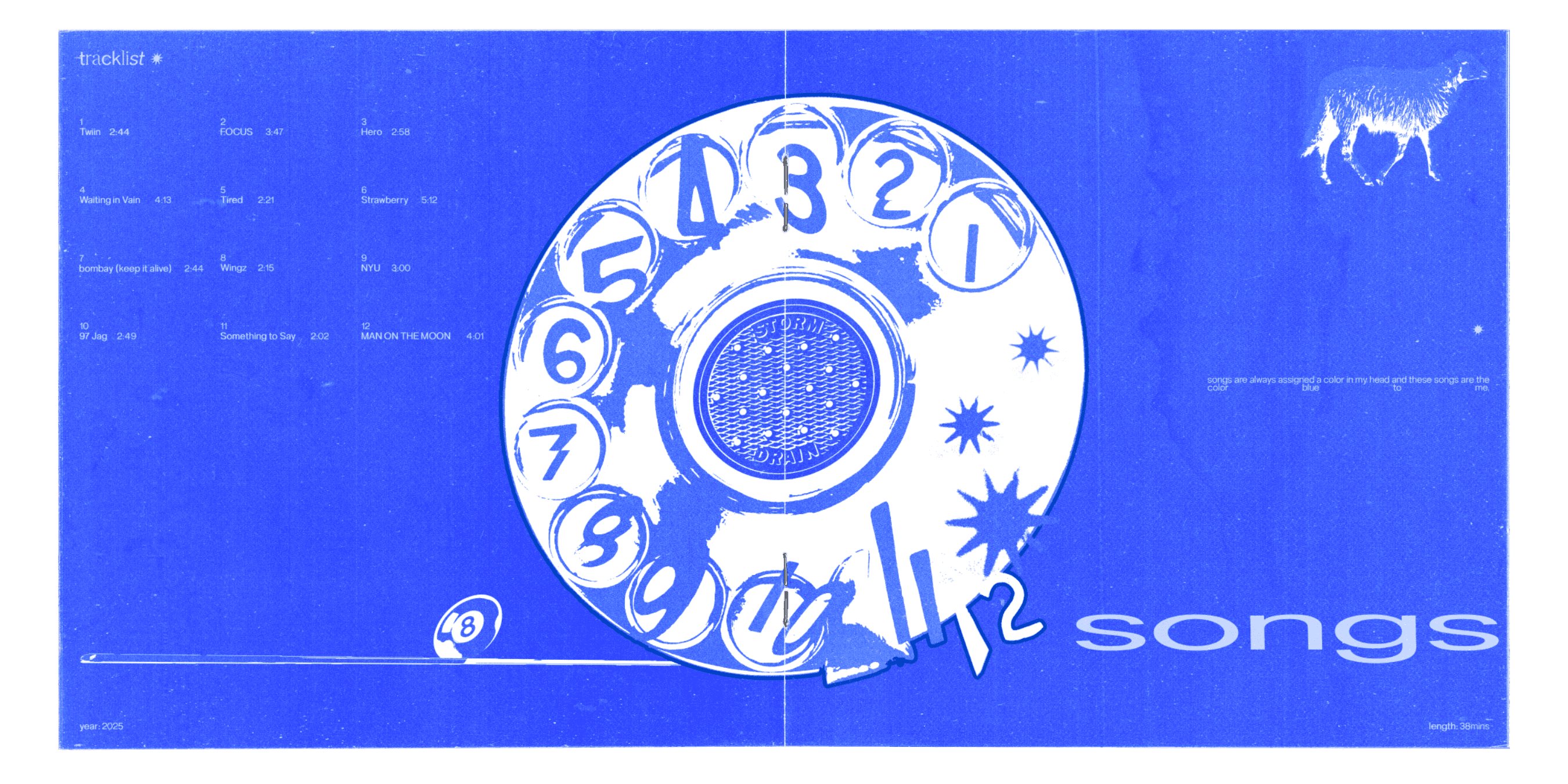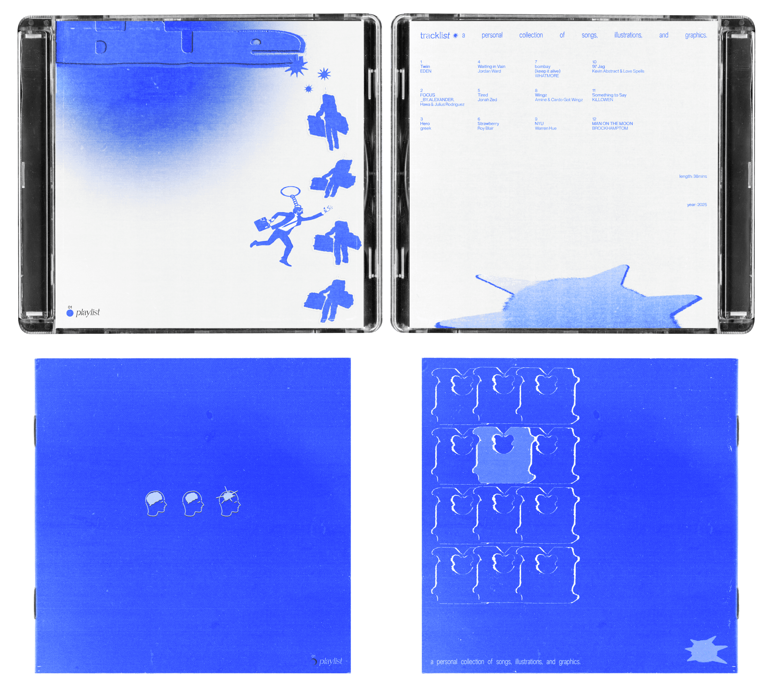 This project started near the end of 2025 when I wanted to organize my most listened to songs of that year into specific playlists. I was reminded of my childhood memories of burning music onto CDs and the impact it had on me at the time. So, I decided to dedicate an entire project to those memories since music has always been an integral part of not only my design process, but my everyday life. I wanted the project to feel visually cohesive but also personal. To simplify things, I decided to choose twelve of my favorite songs I listened to that year that best represented the chosen color. For each playlist I would design the CD, the cover and back for the case, and a booklet. The booklet contains song lyrics, designs, and illustrations I made while listening to the playlist. After such a long time I finally made something for myself and I hope I can continue to share more of it in the future. (My 2026 playlist will probably be red.)
