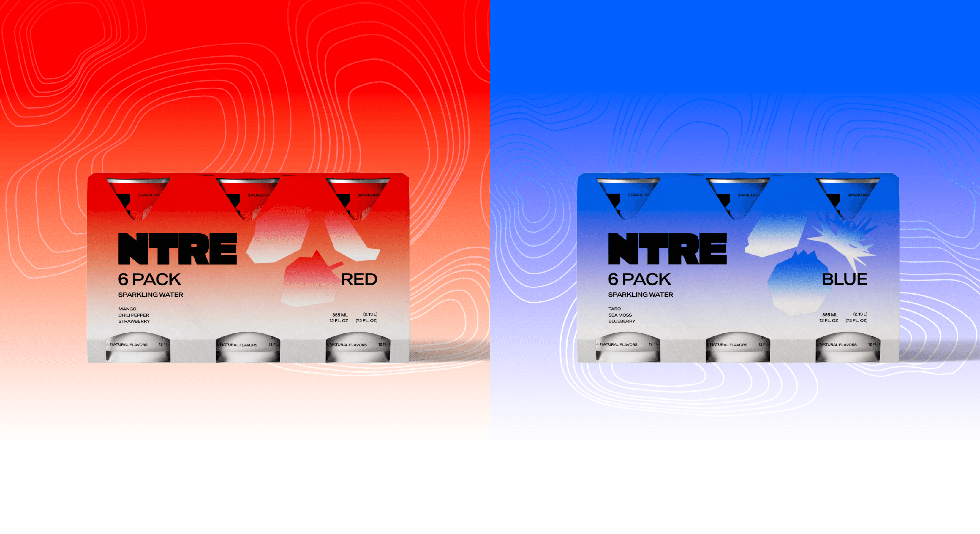 NTRE is an innovative sparkling water brand, delivering unique and refreshing flavor combinations. Each of the three canned drinks, blue, red, and green presented an unconventional mix of flavors. To capture the boldness of NTRE as a brand, the packaging focused on eye-catching and saturated colors. Icons were created to emphasize not just flavors, but the use of all natural flavoring. This project aimed to unite the brand and product, by building a cohesive expression through the packaging.